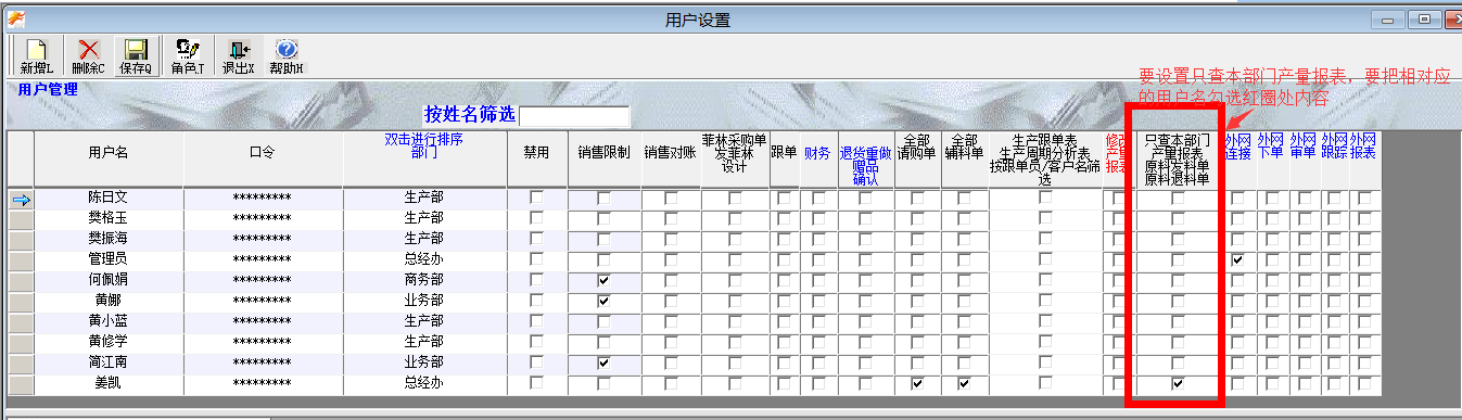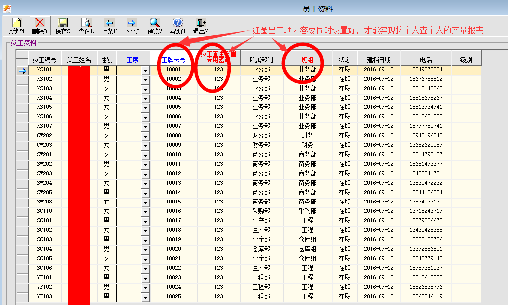 说明:加入要设置个人只能查个人的产量。1. 必须在员工资料里面设置好员工的班组、工牌号、查询密码;2. 必须在用户管理里面设置只查本部门产量报表;3. 相关的图片说明如下